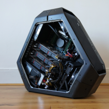 Procesorul Core i7 are parte de răcire cu lichid şi există şi 16 GB RAM la interior, în configuraţie quad channel cu câte 4 GB RAM Samsung. Porturile se afla în spate, iar dacă vă tentează o bestie de genul, preţul porneşte de la 1699.99 dolari.