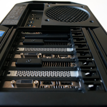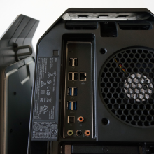 Există şi un mâner în zona superioară, pentru a purta cu voi acest PC la orice LAN party veţi dori. Lateral se afla panouri uşor de deschis pentru a avea acces la interiorul lui Area-51, acestea amintind din nou de hala unei nave spaţiale. La bord se afla un HDD şi SSD, plus o nebunie grafică: 3 plăci Radeon R9 290X, pentru care Alienware a construit un suport special.
