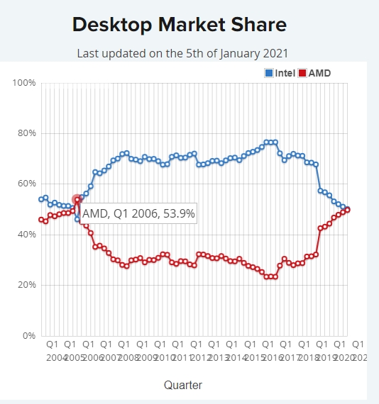 Graficele și datele din acest articol se pot vedea pe site-ul PassMark. Observăm că doar în anul 2006 procesoarele AMD dedicate desktop-urilor s-au vândut mai bine decât cele Intel și atunci doar în primul trimestru din acel an.