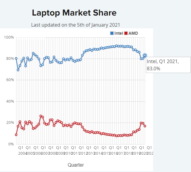 Pe de altă parte, dacă vorbim despre laptop-uri, Intel domină cu 83.8%. Posibil totuși să vedem o schimbare aici în viitor. Intel are parte de concurență serioasă din partea Apple și a altor companii producătoare de cipseturi. De asemenea, nu putem uita faptul că Intel nu a reușit în anul 2020 să ofere soluții bazate pe tehnologia de 7nm. Pentru 2021 AMD a anunțat deja că lucrează la un nou CPU care va fi proiectat pe tehnologia de 5nm.