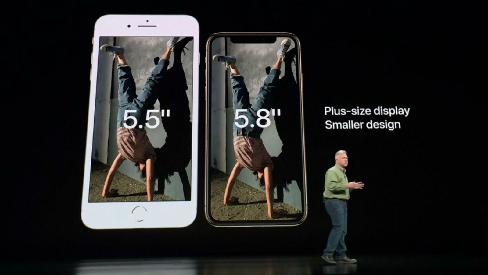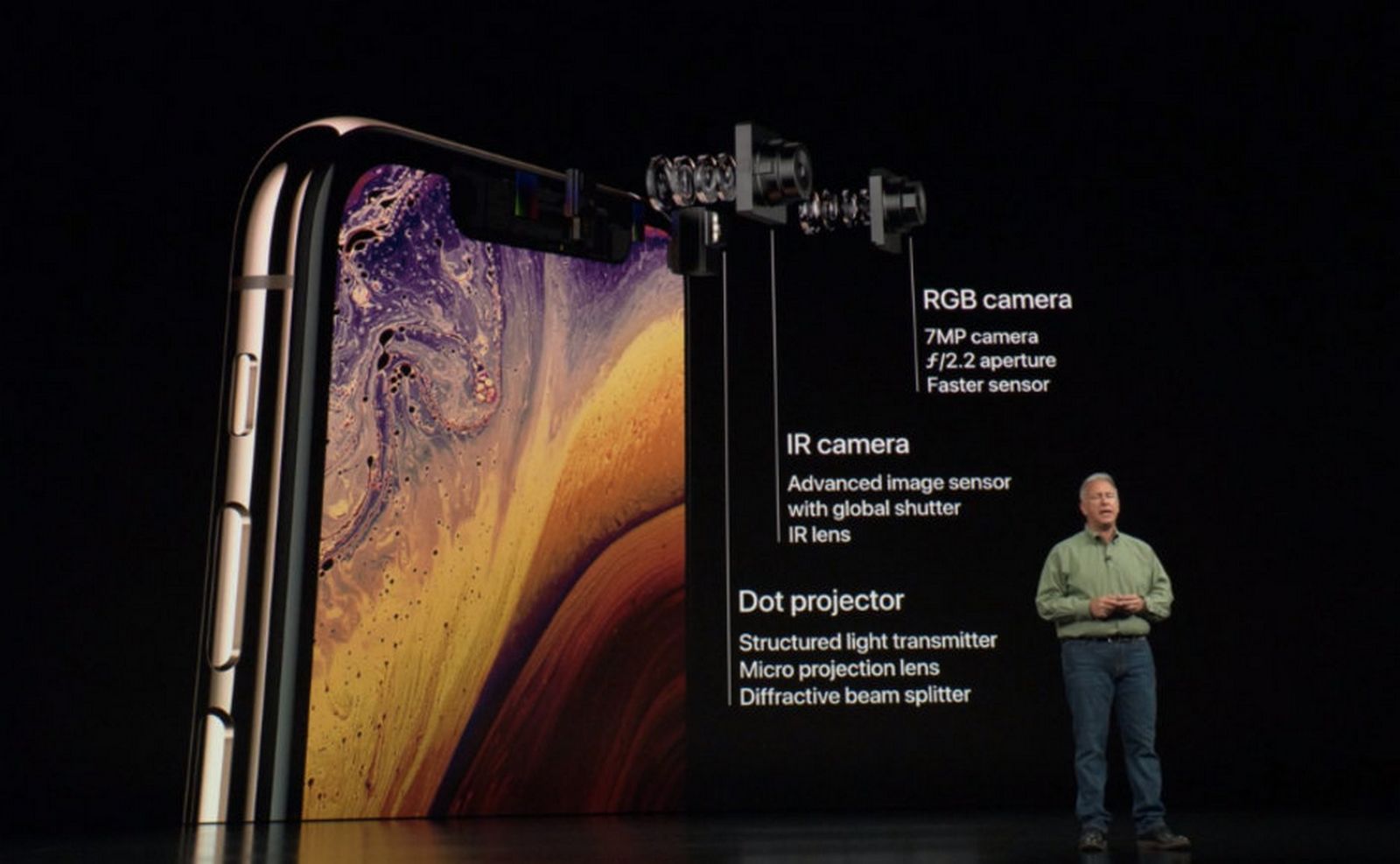 Se păstrează ecranul OLED de 5.8 inch, sistemul Face ID este îmbunătățit și primim acum noul CPU Apple A12 Bionic și variante cu 64, 256, respectiv 512 GB. iPhone Xs aduce și o cameră duală actualizată, aceasta oferind posibilitatea de a regla punctul de focus din fotografii chiar și după realizarea acestora. Are certificare IP68, difuzoare stereo și bateria ar oferi cu o oră mai multă autonomie decât predecesorul.