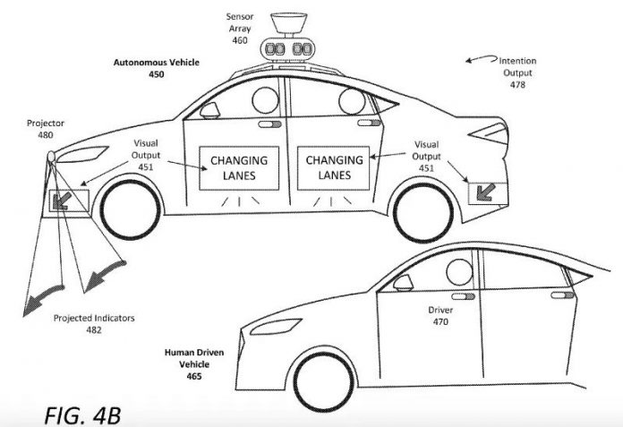 Şi Google are brevete de gen, ceva mai bătrâneşti, precum semnale luminoase cu „Walk” sau „Don’t Walk”, un fel de semafoare pe corpul maşinii.
