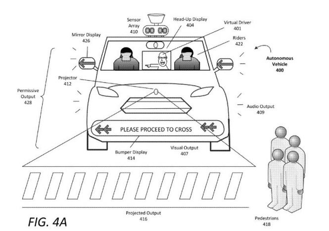 Rămâne şi claxonul sau vorbele „dulci”. Pe de altă parte o maşină care rulează fără şofer nu are aceste mijloace de comunicare. Uber a brevetat un sistem de flash-uri luminoase speciale, practic săgeţi luminoase care apar pe oglinzile laterale. Apoi un proiector afişează o trecere de pieton virtuală în faţa maşinii, iar un şofer virtual apare pe parbriz pentru a indica direcţia corectă pietonilor.
