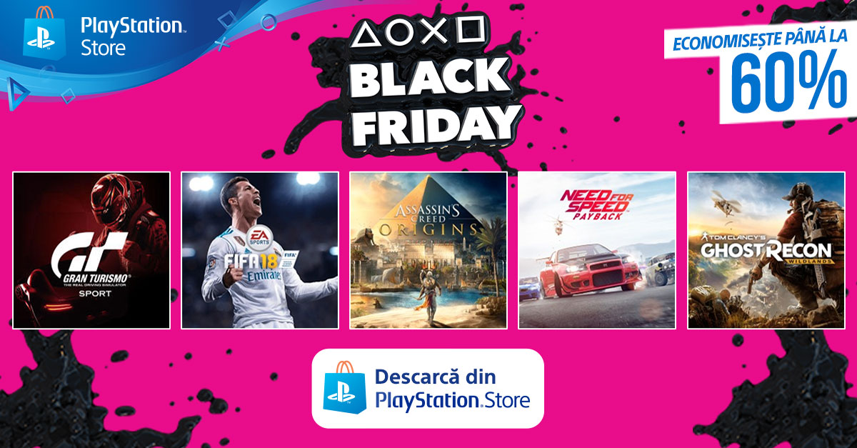 Reducerile sunt de 40% pentru Fifa 18, 50% pentru Gran Turismo Sport, 30% pentru Assassin’s Creed Origins și 40% pentru Need for Speed Payback. De asemenea, printre alte titluri importante ce primesc discount-uri se numără și Tom Clancy’s Ghost Recon Wildlands (60% reducere), respectiv The Witcher 3: Wild Hunt – Game of the Year Edition (60% reducere).