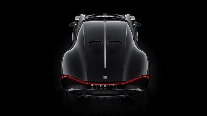 Şasiul său este realizat în întregime din fibră de carbon, iar în spate găsim 6 ţevi de evacuare. Bugatti La Voiture Noire este realizat într-un singur exemplar şi reprezintă un omagiu adus lui Type 57 Atlantic, dacă vă uitaţi cu atenţie la design. Fiecare componentă este realizată manual, iar caroseria din fibră de carbon are un luciu negru şi strident.