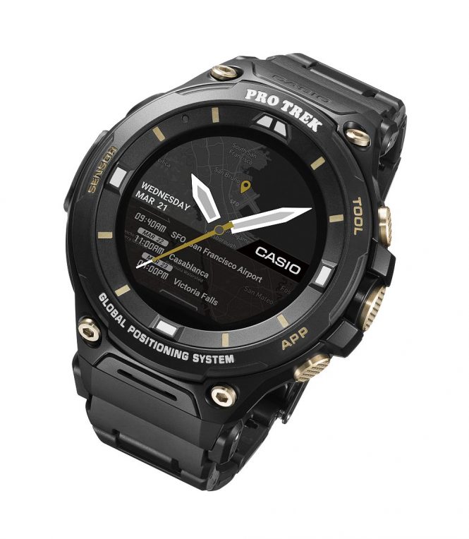 Vine cu butoane acoperite cu metal ionizat lateral şi tratate IP pentru rezistenţa la uzură. „Cureaua” ceasului e mai mult o brăţară dintr-un material compozit, care combină metalul, urethan-ul şi răşina. Corpul e fabricat din oţel inoxidabil, iar Casio WSD-F20SC are certificare militară MIL-STD-810G. Ca atare, produsul rezistă până la o adâncime de 50 de metri. Vine şi cu GPS, Bluetooth, WiFi şi rulează Android Wear 2.0, cunoscut şi ca Wear OS.
