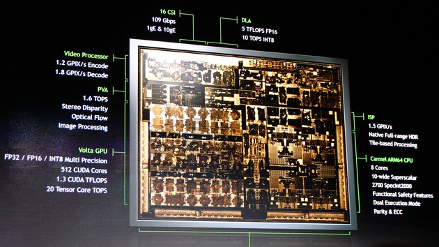 NVIDIA a participat la rândul său la CES 2018, prezentând un nou SoC la nivel de specificaţii, pe numele său Xavier. Acesta este cel mai complex chipset al companiei, integrând 9 miliarde de tranzistori. Este deci şi cel mai dens design de SoC de până acum.