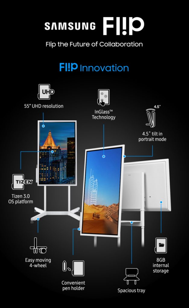 Samsung Flip este uriaş, dar este şi portabil, având un suport cu roţi care poate fi mutat în altă cameră. Dotările includ un ecran de 55 inch cu rezoluţie 4K. Se poate înclina la 4.5 grade în mod Portrait, are tehnologie InGlass şi rulează Tizen OS 3.0. Noul device se deplasează cu ajutorul a 4 roţi şi are un suport pentru stylus comod, plus 8 GB stocare.