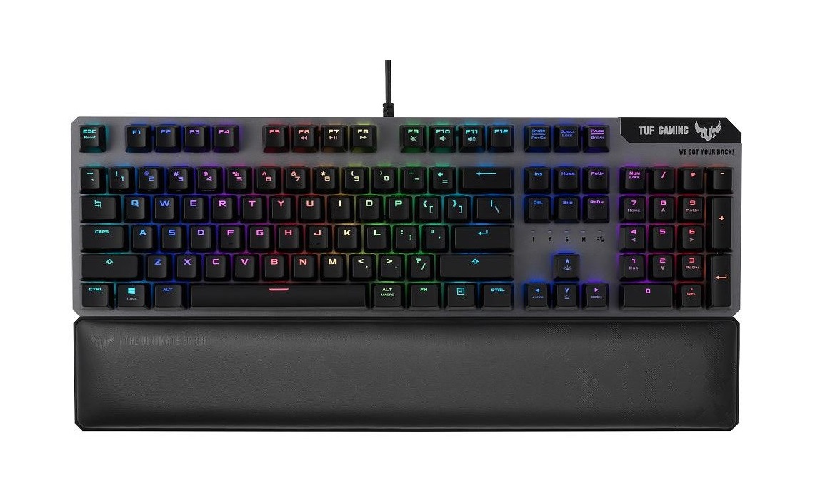 ASUS TUF Gaming K7 este o tastatură uşoară şi rapidă, cu switch-uri TUF optic/mecanice. Este şi extra rezistentă, mulţumită unei construcţii metalice şi a protecţiei IP56. Activarea tastelor se face în doar 0.2 ms. Designul este unul frameless, fără muchii groase, iar logo-ul superior este fabricat din fier, în vreme ce zona de palm rest este din piele neagră sau imitaţie de piele.