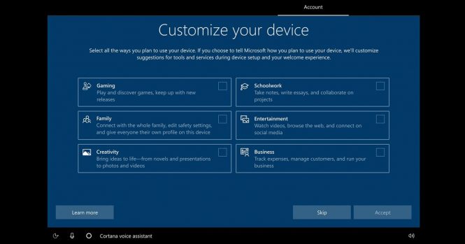 „Pe baza feedback-ului, explorăm posibilitatea de adăugare a unei pagini de personalizare la configurarea Windows(OOBE). Acest lucru ne permite înțelegerea modului în care doriți să utilizați dispozitivul, ajutând astfel la personalizarea acestuia”.