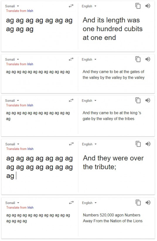 Google foloseşte AI-ul pentru platforma de traduceri Translate, dar acest AI şi-a dat în petec recent, traducând în mod total bizar o înşiruire de cuvinte. Ştim că e doar un bug, dar e foarte bizar.
