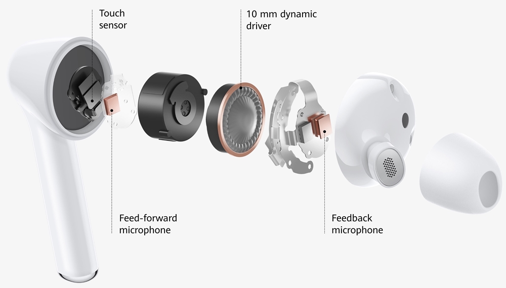 Mai mult de atât avem parte aici și de anulare activă a zgomotului de fond (ANC) până la 32dB. Căștile Freebuds 3i include control tactil, astfel că la o apăsare mai lungă pe una dintre căști vom activa sistemul ANC. Printr-un dublu tap vom reda muzica sau da pauză, dar și răspunde/încheia un apel.
