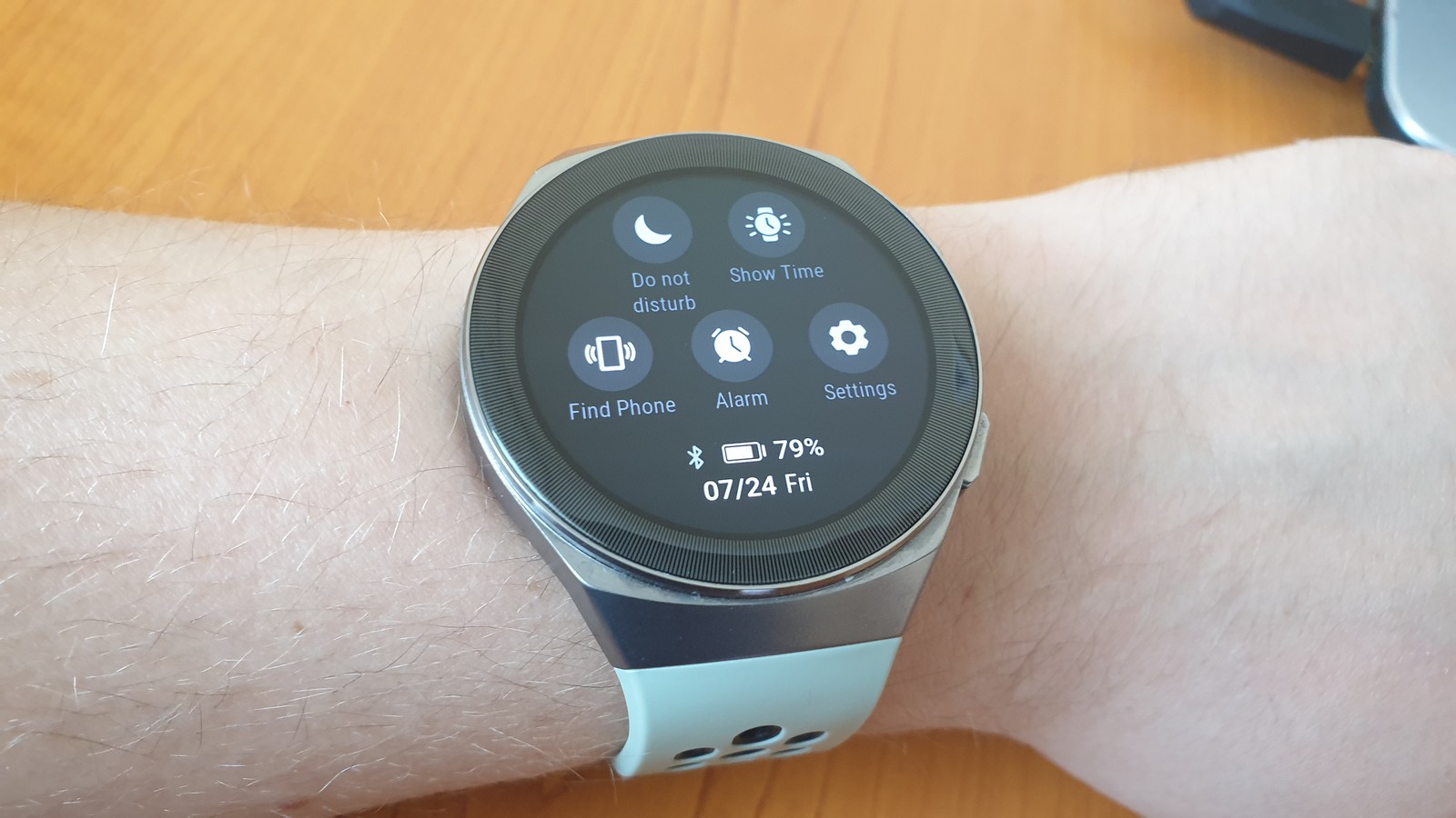 De aici puteți activa modul DND, seta alarme, apela la funcția Find my Phone sau accesa zona de setări. Un swipe de jos în sus îți va afișa notificările. Prin swipe de la stânga la dreapta sau dreapta la stânga treci prin meniurile pentru player audio, date monitorizare fitness, vreme, test Stres, monitorizare puls.