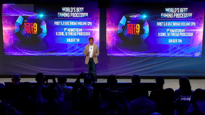 Astfel, a prezentat două jocuri care ar putea rula pe baza unui Intel Core i9, cu frame rate excelent. PUBG şi World of Tanks rulau în acelaşi timp pe acelaşi computer în mod excelent. Intel Core i9-9900K ar fi primul CPU produs în masă care atinge frecvenţa de 5 GHz. Generaţiile noi Core i5, i7, i9 ajung în magazine de pe 19 octombrie.