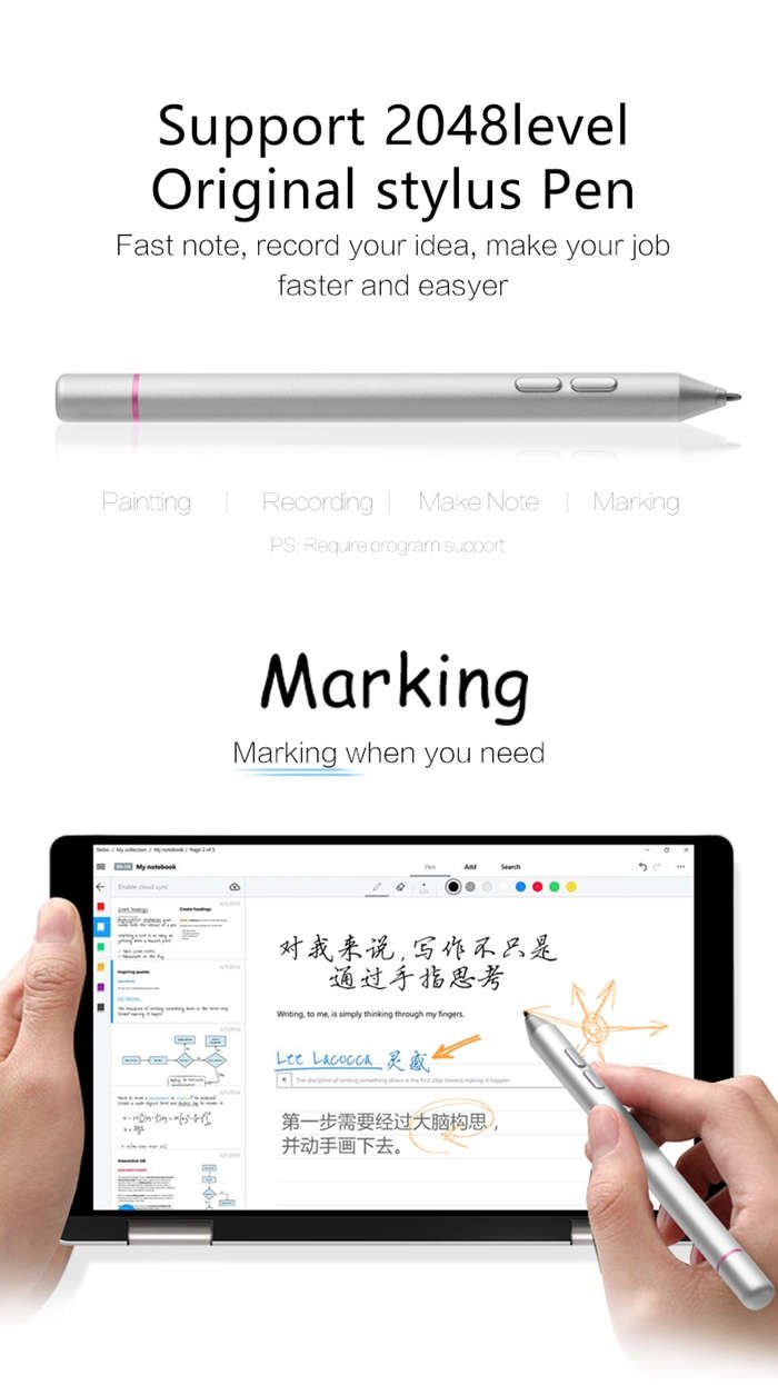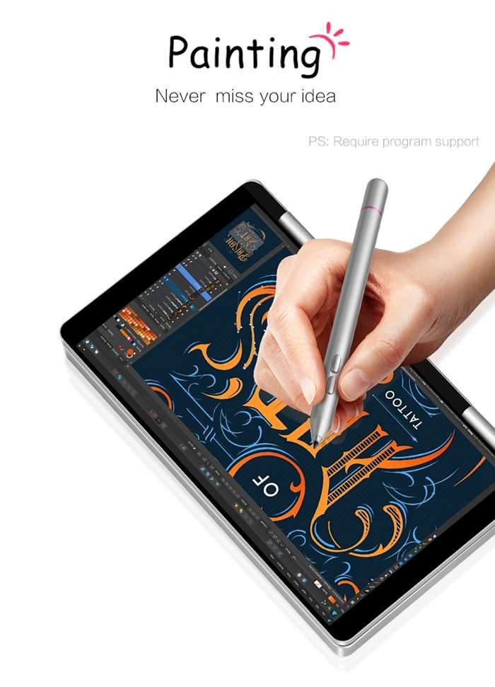 Nu îmi e foarte clar dacă stylusul e oferit la pachet, dar aşa pare. Rulează Windows 10 full şi are o ciudăţenie: un pointer infraroşu în mijlocul tastaturii ca înlocuitor de mouse. Tastatura este iluminată.