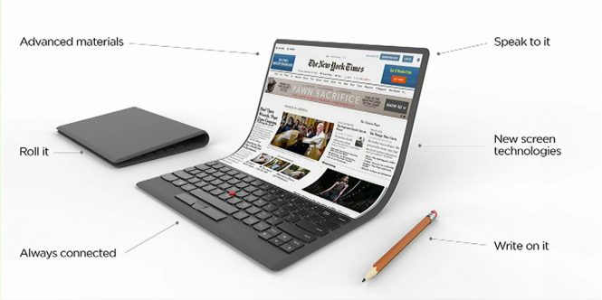 Debutul terminalului pe care îl vedeţi mai sus a avut loc în cadrul unui eveniment organizat la New York. Avem de-a face cu un soi de laptop cu o îmbinare mai uniformă a zonei ecranului cu cea a tastaturii. Acest notebook se poate îndoi ca o bucată de hârtie şi se poate apoi rula şi ţine în rucsac. Deocamdată acesta rămâne doar un concept, prezentat sub formă de randare Lenovo şi cu termeni vagi.