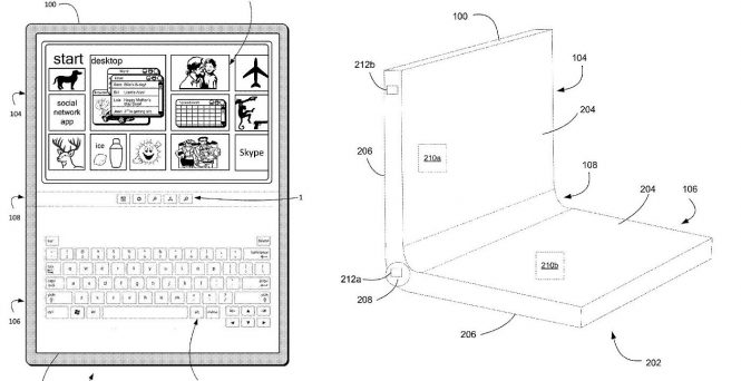 Noul brevet Microsoft ne prezintă o tabletă care se pliază pe din două pe mijloc, cu o balama discretă, dar apoi se şi conectează la o tastatură. În ultimele luni am fost bombardaţi şi invadaţi de brevete Samsung şi Microsoft, care ne prezintă fie telefoane cu două ecrane, care pot fi folosite şi ca tablete, fie tablete care se pliază pe mijloc. Recent am văzut şi balamale tot mai complicate care facilitează îndoirea terminalelor respective.