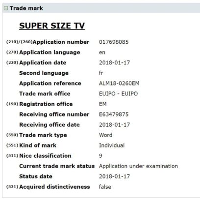 Samsung a înregistrat numele „Super Size TV” şi „Giant TV” pentru viitoare produse. Recent sud coreenii au înregistrat şi trademark-uri legate de televizoare 8K QLED şi Micro QLED. Dacă acelea erau înregistrate la Biroul de Proprietăţi Intelectuale din Coreea de Sud, cele noi au fost înregistrate la Biroul European de Proprietăţi Intelectuale. „Super Size TV” şi „Giant TV” au fost înregistrate pe 17 şi 19 ianuarie.