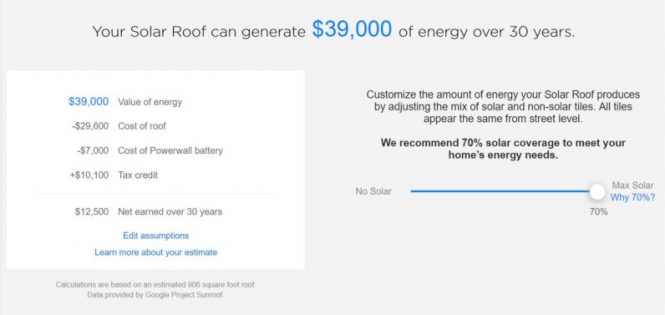 Un exemplu este dat de către editorul TheNextWeb care și-a calculat costul de instalare a lui Solar Roof pe casa sa. Cu un procent de 70% acoperire solară și întins pe o suprafață de 85 metri pătrați, sistemul ar ajunge la suma de 38,600 dolari alături de bateria Powerwall la pachet.