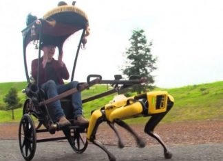 Adam Savage de la Mythbusters se deplasează cu un robot Boston Dynamics înhămat la...