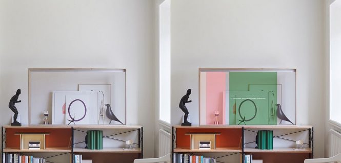 Ecranul OLED transparent creează imaginea unui cabinet din sticlă, care include şi un cadru de lemn, care susţine panoul din sticlă. Această piesă de mobilier se va potrivi cu orice spaţiu contemporan de locuit şi este uşor de integrat în orice încăpere. Panasonic şi Vitra au colaborat pentru a dezvolta ecranul OLED transparent de aici.