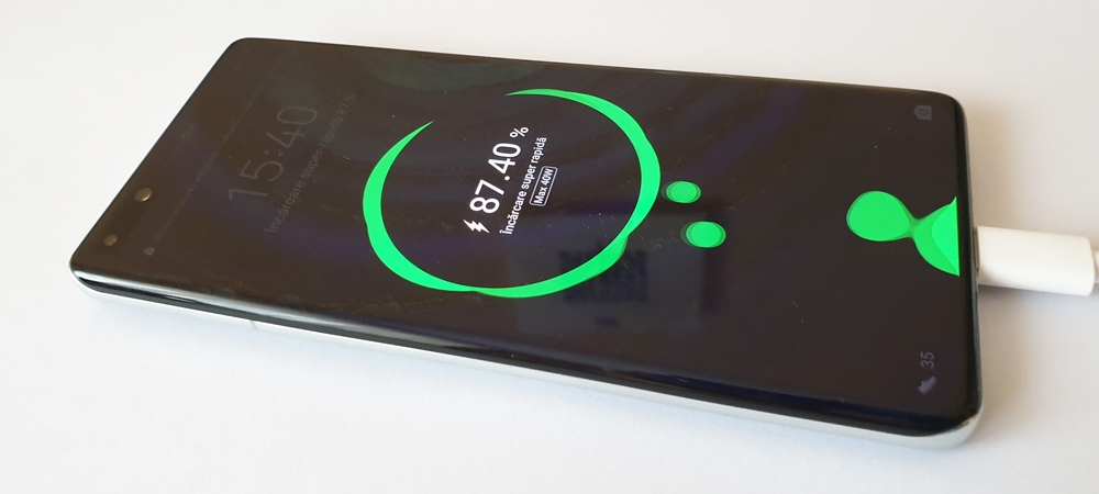 După cum vă informam și în lista de specificații de mai sus, Huawei P40 Pro sosește echipat cu o baterie de 4200 mAh. Aceasta este integrată într-o carcasă cu grosime de 9mm și greutate de 209 grame. Avem suport pentru alimentare rapidă la 40W cu adaptorul din cutie, ceva important de menționat pentru că alți producători oferă accesoriul separat contra-cost, în cutie sosind un adaptor mai încet.