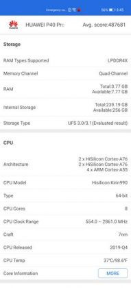 Acesta include 2x nuclee Cortex-A76 de 2.86 GHz + 2x nuclee Cortex-A76 de 2.36 GHz și 4x nuclee Cortex-A55 de 1.95 GHz. Are un procesor grafic Mali-G76 MP16 și varianta de față aduce 8 GB RAM + 256 GB stocare flash UFS 3.0. Dacă sunteți interesați de extinderea spațiului de stocare, aflați că telefonul are slot NM de până la 256 GB.