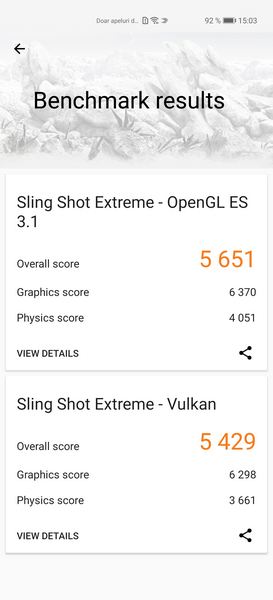 Deși benchmark-urile nu atestă performanța reală a unui telefon, am făcut și câteva astfel de teste. Le vedeți mai sus și aflați că am atins 463138 puncte în AnTuTu. Scorurile din GeekBench 4 au fost de 3860 puncte la testul single-core, respectiv 12263 puncte la testul multi-core. Nu am uitat de partea grafică și am utilizat GFXBench pentru a vedea ce poate telefonul. S-au obținut 5651 puncte la testul Sling Shot Extreme – OpenGL ES 3.1, respectiv 5429 puncte la testul Sling Shot Extreme – Vulkan.