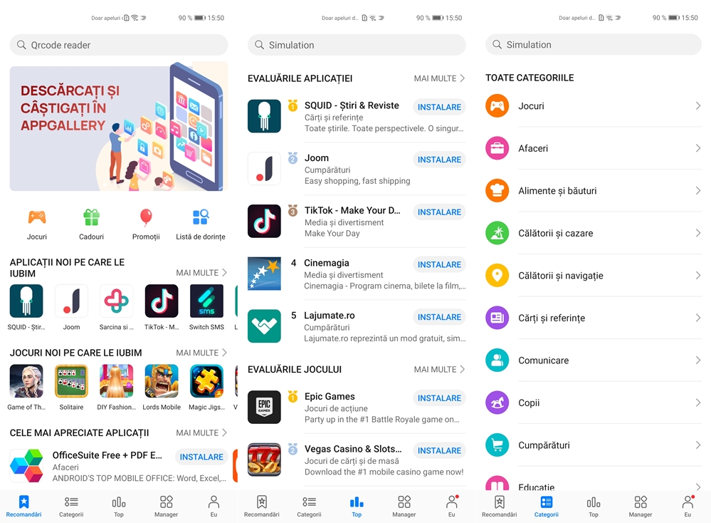 După cum vedeți nu prea mă joc pe telefon, dar în AppGallery găsiți multe jocuri. Am transferat cu succes și aplicația de printare Canon Print, tastatura virtuală Fleksy pe care o folosesc de câțiva ani. De asemenea și aplicația SmartPad prin care controlez un bec smart a rulat fără probleme.