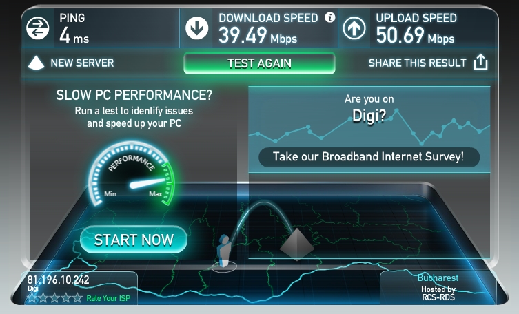 Înainte de a trage concluzii trebuie să știți că am folosit o bandă de 100Mbps RCS&RDS, așa că rezultatele sunt favorabile. La download am atins 39.49 Mbps, iar la upload 50.69 Mbps – cu mențiunea că s-a utilizat aici conexiunea 2.4GHz. Pe hârtie se promit viteze de transfer de până la 867 Mbps (5GHz), respectiv 300 Mbps (2.4GHz).