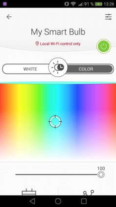 De aici alegeți nuanța potrivită de alb, dar și culoarea preferată în cazul în care vreți să transformați atmosfera din cameră într-una mai deosebită sau de ce nu romantică. Se poate seta și nivelul de luminozitate sau intensitatea culorii (temperatură culoare cuprinsă între 2500K și 9000K), becul de față oferind o luminozitate de maxim 800 lumeni.