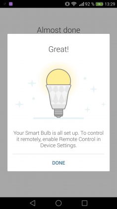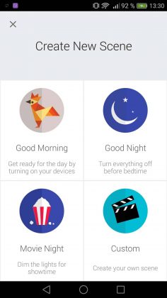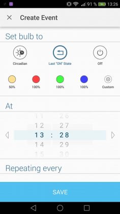 Interesant este și faptul că se pot seta scenarii predefinite sau crea unele noi. De asemenea, se oferă o modalitate prin care becul se va aprinde automat și își va regla luminozitatea/culoarea în funcție de perioada zilei. Desigur se poate seta din meniu și o oră de aprindere, respectiv stingere a becului și zilele în care această preferință să fie aplicată.