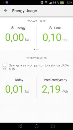 Aplicația Kasa oferă și o secțiune de tip manager consum de unde se poate vedea exact câtă energie consumă becul, becul promițând o economisire cu până la 80% mai mare a energiei, asta fără a se face compromis de la calitate sau intensitate. Consumul efectiv este de 11W în modul de funcționare, respectiv de 1.5W atunci când becul este stins.