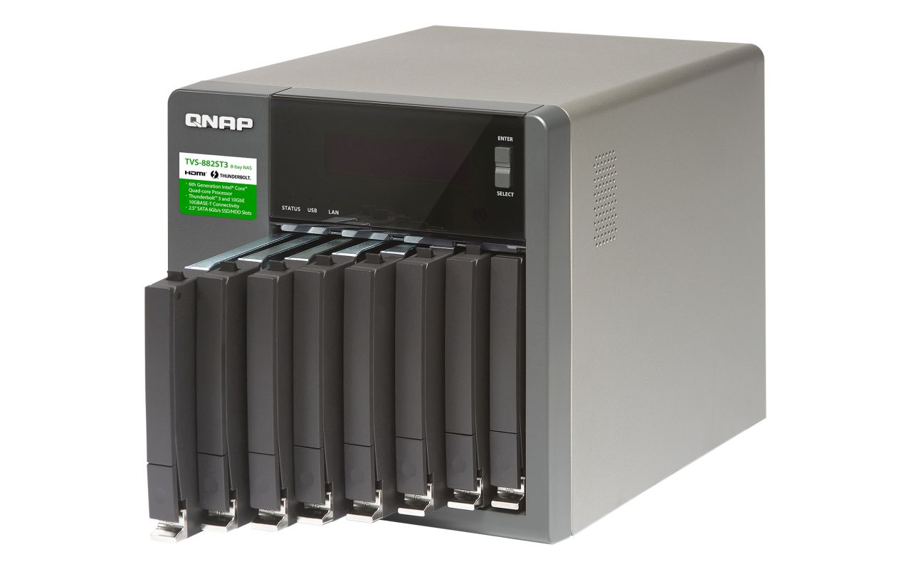 Este inclusă criptare AES-NI, iar TVS-882ST3 propune conectivitate duală Thunderbolt 3, porturi duale de reţea 10GBASE-T 10GbE, plus porturi USB 3.1 (10 Gpbs Type-C/ Type-A) şi HDMI 4K. Acesta este un NAS compact, ideal pentru cei care lucrează cu multe date şi sunt utilizatori de Mac cu Thunderbolt 3 de exemplu. Evident şi cei de pe Windows pot apela la acest servere pentru a îşi salva zecile de giga de editare video să zicem.