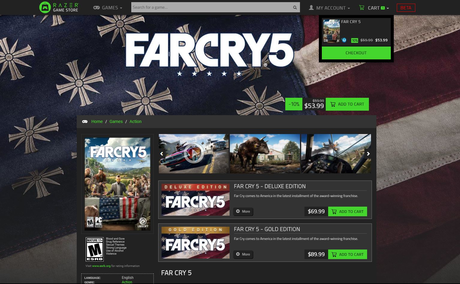 Sunt puse la bătaie şi oferte exclusive, vouchere Razer Game Store şi reduceri. Pe măsură ce vă creşteţi colecţia de jocuri veţi aduna şi puncte de loialitate ZSilver, dar există şi zGold. În România Razer Game Store este disponibil în limba engleză şi cu preţurile afişate în euro. Pe lista de jocuri oferite în magazin se numără titluri ca The Crew 2, Far Cry 5, Cuphead, Dishonored, Tom Clancy’s Ghost Recon: Wildlands şi Pillars of Eternity II.