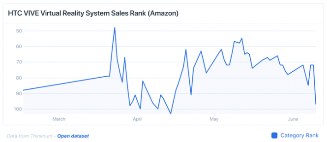 PlayStation VR a avut un boost de vaznari prin februarie, dar din martie e în plin picaj. Avea succes datorită acelui bundle cu Skyrim, apoi a picat şi preţul, dar tot nu a fost de ajuns. Bundle-ul se afla pe locul 29 între toate produsele din categoria Gaming în februarie, dar acum se află pe locul 100 la Amazon. HTC Vive sosea în varianta actuală comercială prin 2016 şi la 799 de dolari necesita şi un PC puternic pentru a fi pus la treabă.
