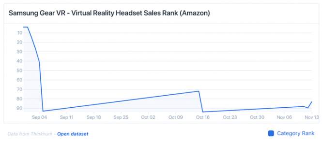 Vânzările mergeau bine la final de martie şi au mai fost ceva spike-uri, dar din iunie a fost în picaj. Samsung Gear VR stă cel mai prost, cu picaj clar încă din toamnă trecută. Gear VR se lansa încă din 2014 şi se baza pe aportul smartphone-urilor. Cea mai populară versiune a sa intra în top 10 produse de gaming în septembrie 2016. Acum se află pe locul 83 din 100.