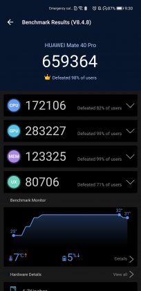 Mate 40 Pro integrează noul procesor Kirin 9000 5G realizat pe o arhitectură de 5nm. Mai avem 8GB de RAM și 256GB sau 512GB de stocare UFS 3.1, iar ca GPU – Mali G78 MP24. Nu am observat nici urmă de lag în urma folosirii, indiferent de ce am făcut pe el sau câte aplicații aveam în fundal. De asemenea, în jocuri se descurcă foarte bine. Am jucat PUBG și Asphalt 9 la detalii maxime, experiența fiind extrem de plăcută și fluidă. De asemenea, telefonul nu suferă de supraîncălzire. Pentru pasionații de numere, am făcut și două benchmark-uri în Antutu și Geekbench 5 pe care le regăsiți mai jos.