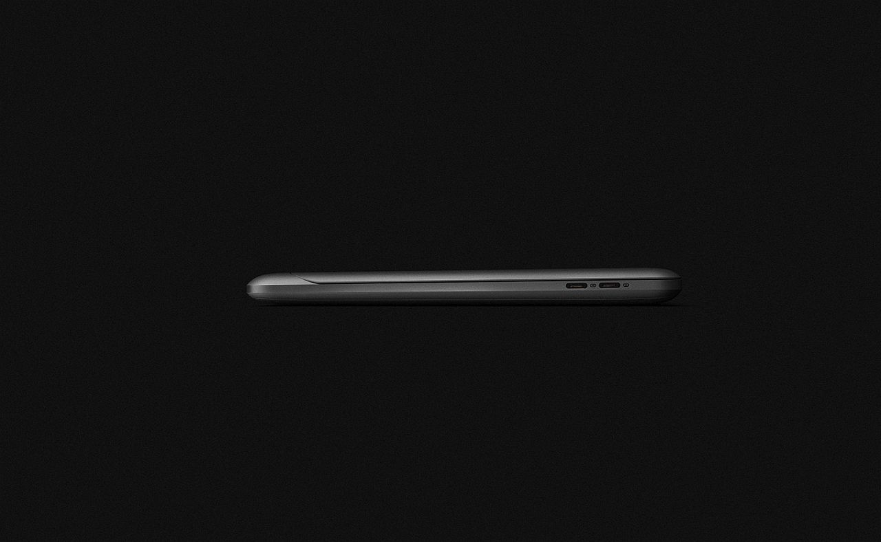 Fanta se află lângă tastatură şi pe acest model nu primim trackpad, ci telefonul preia acest rol. Preia şi rol de pad numeric şi multe alte sarcini pe care le efectuează bara OLED de pe un MacBook Pro de nouă generaţie de exemplu. Construcţia metalică a laptopului este solidă, iar terminalul vine fără CPU, GPU şi cooler, care sunt integrate pe telefon.
