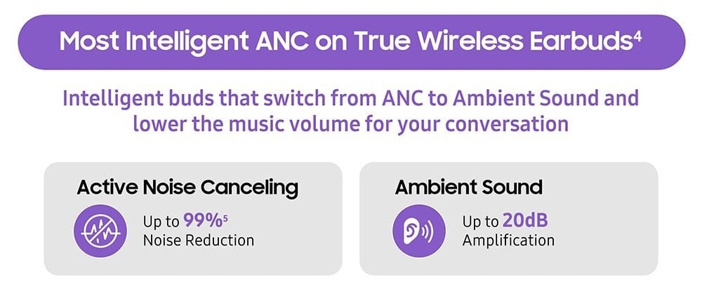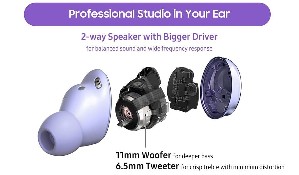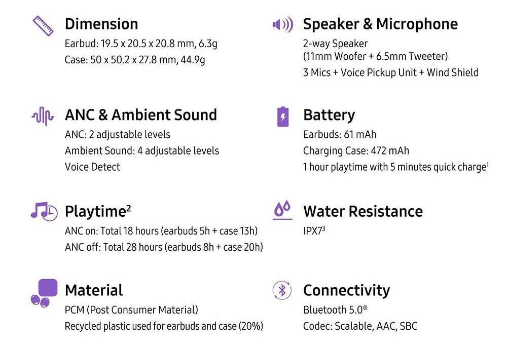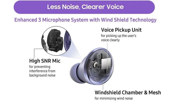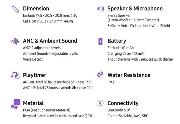 Folosind cutia de purtare cu baterie proprie de 472 mAh autonomia urcă la 18 ore cu ANC, respectiv 28 ore fără ANC. Aceste căști dispun și de certificare IPX7 pentru rezistență la apă și praf. Primim pe fiecare cască un woofer de 11mm și un tweeter de 6.5mm. Buds Pro sosesc pe violet, negru sau argintiu și costă 1.099 lei la precomandă.