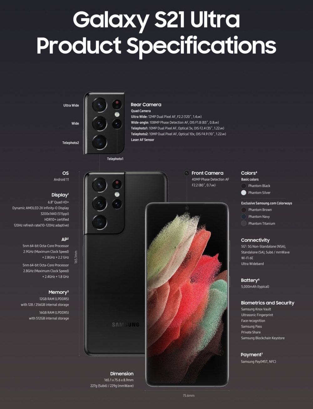 Modelul Ultra vine cu o cameră selfie de 40 mpx și cu următorul setup în spate: 108 mpx wide (OIS) + 10 mpx periscop (zoom optic 10x) + 10 mpx telephoto (zoom optic 3x) + 12 mpx ultra-wide). Filmează 8K la 24fps (și S21/S21+ pot filma la această rezoluție) și are ca extra un telemetru laser pentru focalizare rapidă.