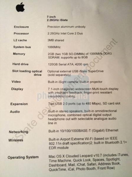 Va reamintim ca Apple are programat un eveniment oficial pentru data de 26 ianuarie, in cadrul caruia va lansa probabil tabletul mult-asteptat. In ce priveste lista de specificatii, Apple iSlate vine cu un display touch de 7 inchi, un procesor Intel Core 2 Duo de 2.26 GHz, 2 GB memorie SDRAM DDR3, un HDD de 120 GB, o camera iSight incorporata si un proiector.