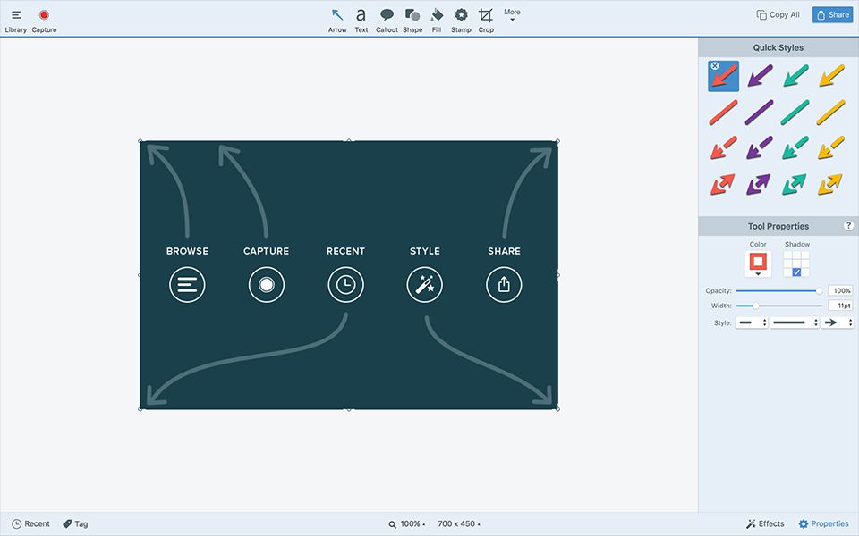 Există acum şi o secţiune Favorites, cu ajutorul căreia veţi putea aduna laolaltă tool-urile necesare. Nu mai e nevoie să tot căutaţi săgeţi, stamps, forme geometrice şi tot felul de chenare şi indicii. 2000 de stamp-uri pre-programate sunt în această versiune, un soi de stickere şi simboluri dacă vreţi, utile pentru a ilustra o captură. Sunt pe listă simboluri, iconuri, cursoare, grafice.