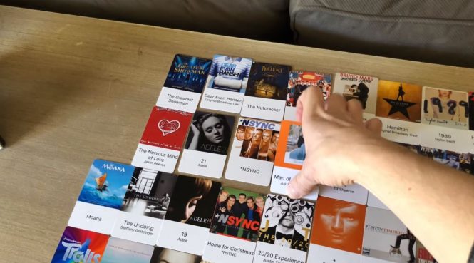Ideea specială aici este de a alege melodia sau artistul preferat folosind acele cartonaşe. Pe numele său „hoveeman”, creatorul acestui sistem tip tonomat a legat totul la Google Home şi difuzoarele Chromecast. Sistemul funcţionează astfel: utilizatorul ia un cartonaş îl atinge de un senzor din lateralul biroului său şi începe melodia preferată.