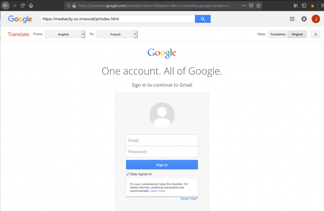 În schimb în spatele unui link pe bază de Google Translate se afla un site al unor hackeri care încercau să obţină date de login Google. Trecerea prin Google Translate s-a lăsat cu transformarea linkului aşa încât să înceapă cu „www.translate.google.com”. Şi după primul click ajungi tot pe pagina legitimă Google Translate, iar linkul maliţios e în bara de căutare Google Translate, unde ţi se cere să te loghezi.