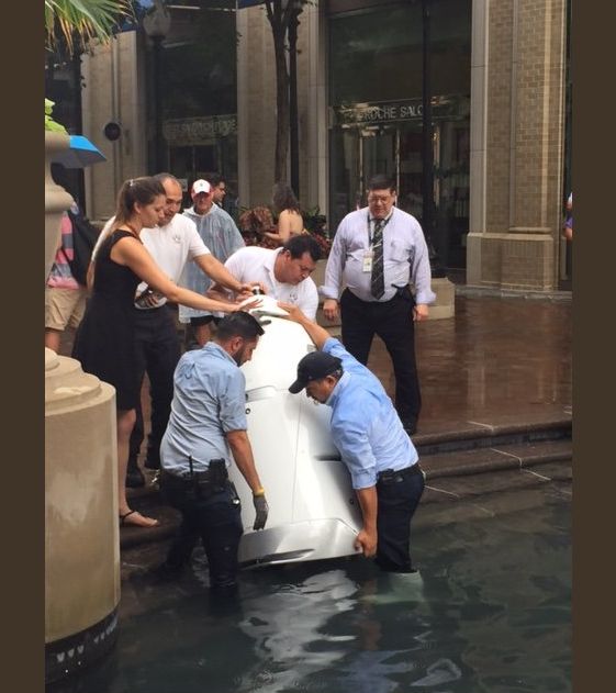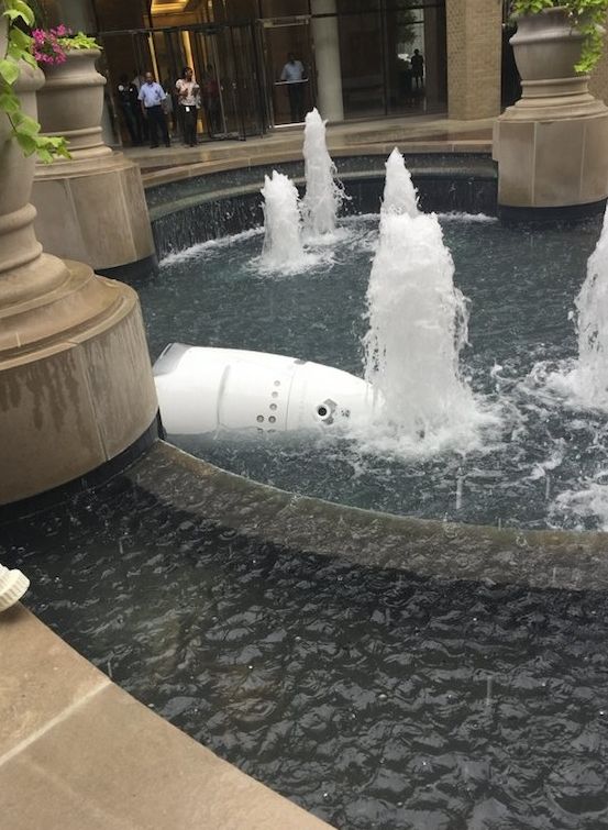 E vorba despre un robot de securitate din Washington DC, care opera într-o clădire de birouri. Modelul respectiv este Knightscope K5 şi cântăreşte 136 kilograme, având o înălţime de 1.52 metri. Formatul acestui robot nu îi permite să se ridice prea uşor dacă este dărâmat, el neavând braţe sau mânere. Nu e foarte clar cum şi de ce a ajuns în fântână maşinăria, deci ideea de „sinucidere” e mai degrabă o glumă.