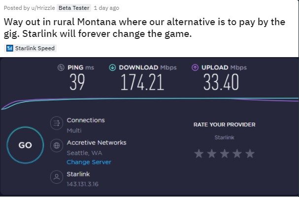 Un utilizator de pe Coasta de Vest, a postat o captură de ecran pe Reddit, afișând o viteză de descărcare de 161 Mbps. Alt membru, aflat în zona rurală a Montanei a obținut 174 Mbps download și 33 Mbps viteză de upload „Programul Starlink va schimba totul în viitor”, spun ei.