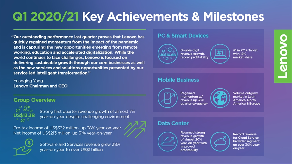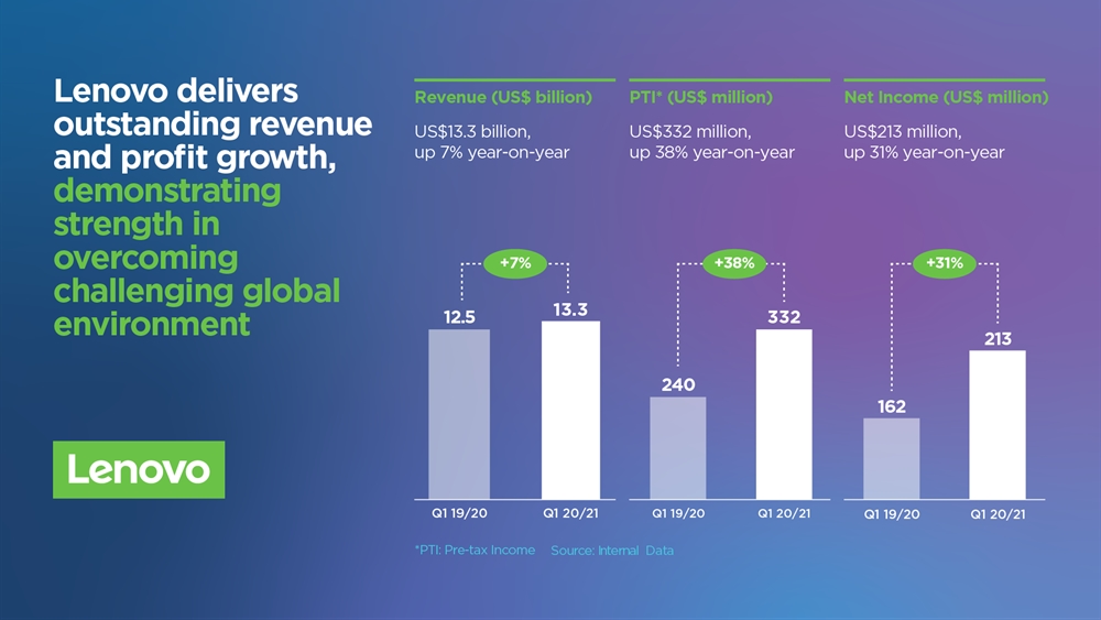 În această perioadă de 3 luni, Lenovo a anunțat o creștere a veniturilor cu 7% mai mult față de aceeași perioadă a anului trecut, ajungându-se astfel la suma de 13.3 miliarde de dolari. A crescut și profitul înregistrat înainte de impozitate, cu 38% comparativ cu trimestrul 1 al anului fiscal anterior – ajungând la 332 milioane de dolari.