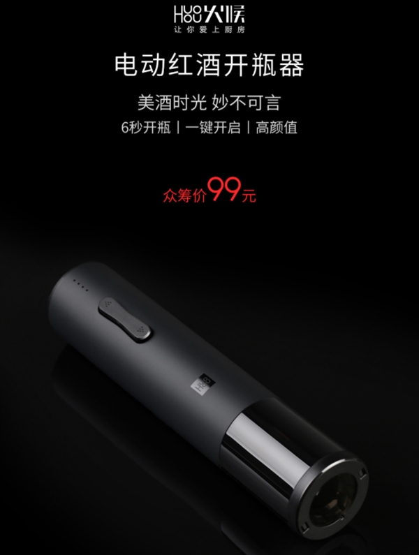 Xiaomi Electric Wine Opener este un tirbuşon electric, care are nevoie de doar 6 secunde pentru a deschide o sticlă de vin roşu. Foloseşte un motor pe bază de magnet permanent şi implică mecanisme rotative din aliaj de bronz. Rotirea rapidă permite deschiderea sticlei în doar 6 secunde, iar nivelul de zgomot e scăzut, sub 60 de decibeli.